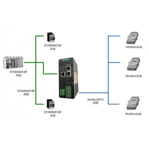 HT3S-EIS-MDN網(wǎng)關(guān)連接到EtherNet/IP總線中作為從站使用,連接到MODBUS-RTU總線中作為主站或從站使用。