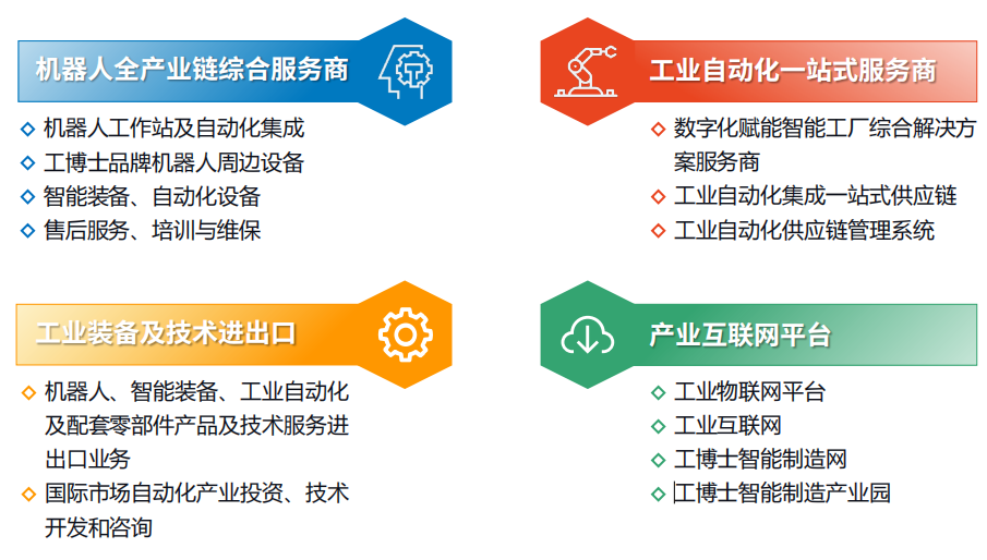 公司業(yè)務(wù)覆蓋智能裝備、產(chǎn)業(yè)互聯(lián)網(wǎng)、工業(yè)自動化、工業(yè)裝備出口四大核心領(lǐng)域。致力于打造行業(yè)機器人、