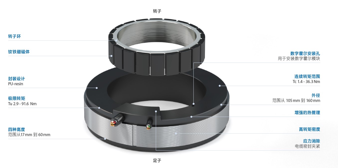 不同的繞組類型使該電機適用于各種半導體和機器人的低電壓或600V的應用。 轉矩 極限轉矩: 5.6 – 55.5 Nm 峰值轉矩: 3.8 – 35.3 Nm 連續轉矩: 2.6 – 21.9 Nm 四種高度: 133-17 //133-25 // 133-34 // 133-60